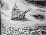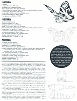 - ↑ The second generation imago from Ebirah, Horror of the Deep is sometimes erroneously given the first generation imago's wingspan of 250 meters, including in the film's theater program. This is corrected to 135 meters in later sources, being more accurately proportional to this incarnation's 40 meter larva length and 65 meter imago length.