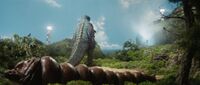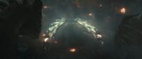 In the Monsterverse, Mothra is again revered as a benevolent goddess, but her origin lies not on Infant Island but rather in China's Yunnan Rainforest. Ancient accounts and paintings of Mothra show that she was worshiped by humans in the ancient past, and she appears in folklore from around the world. Notably, some ancient pictures depict her fighting alongside Godzilla and human warriors against King Ghidorah, either as an account of an ancient battle or a prophecy for a future one. In 2009, a Monarch team headed by Dr. Emma Russel discovered Mothra's cocoon in an ancient temple in the Yunnan Rainforest, dubbed the "Temple of the Moth." She is also revealed to serve as the guardian of the Iwi, the humans indigineous to Skull Island and Hollow Earth, in Godzilla x Kong: The New Empire. An Iwi prophecy foretold that she would return to help Godzilla save the world, and could only be awakened by an Iwi from Skull Island.