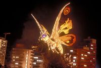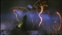 Many thousands of years ago, ancient Japanese warriors slew the monsters Mothra, Ghidorah, and Baragon, laying them to rest and praying for their souls that they might one day return to defend Japan. In 2002, sensing that Godzilla would soon attack Japan to seek vengeance for the lives lost in World War II, the mystical Professor Hirotoshi Isayama attempted to awaken the three Guardian Monsters by destroying ancient stone statues containing the energy from the souls of Japan's honorable dead. Mothra appeared in her larval stage underneath Lake Ikeda, rescuing a dog from a group of hooligans attempting to drown it. She encased their bodies in silk, then constructed a massive cocoon atop the lake's surface. After Godzilla destroyed Baragon and reached Yokohama during his rampage, Mothra hatched from her cocoon in her imago stage and flew there to confront him. She was joined by Ghidorah, but even the combined efforts of the two Guardian Monsters were futile against Godzilla's colossal strength. After subduing both of his foes and destroying most of the Japan Defense Force's units throughout the city, Godzilla prepared to annihilate the final ship in Tokyo Bay with his atomic breath. Mothra flew behind him in order to stop him, but he anticipated her attack and turned around in time to incinerate her. Mothra's energy flowed into the unconscious Ghidorah, reviving him as the Thousand-Year-Old Dragon, King Ghidorah. After Godzilla later destroyed Ghidorah, the spirits of all three Guardian Monsters materialized in the sky above him and flowed into his body, dragging him underwater and allowing Brigadier General Taizo Tachibana to defeat him using the submersible Satsuma.