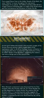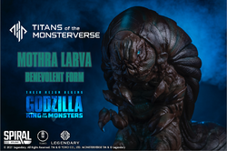 Mothra is part of a lineage of giant moths who were worshiped as benevolent deities in the ancient past. According to Monarch, Mothra appears in ancient folklore and fairy tales from across the world.[4] She possessed a symbiotic relationship with the colossal alpha predator known as Godzilla, and together, surrounded by human warriors, they fought to repel King Ghidorah in the ancient past when the malevolent alien Titan invaded Earth. In 2009, Monarch discovered Mothra's egg in the "Temple of the Moth," a temple dedicated to her in the rainforest of Yunnan, China.