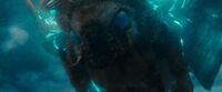 Though all four of the movie's main Titans have bioluminescence, Mothra's is the most extreme. As a larva, she emits orange light when alarmed, red when enraged, and blue when calmed, a nod to the larvae in Godzilla: Tokyo SOS changing their eye color when their mother died.[7] Dougherty wanted the imago to leave trails of luminous dust that gave her a comet-like tail as she flew, but in the interest of not having every scene be overpowered by her presence, he opted to have it disperse as she flew and mix in with surrounding clouds.[8]