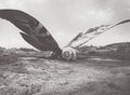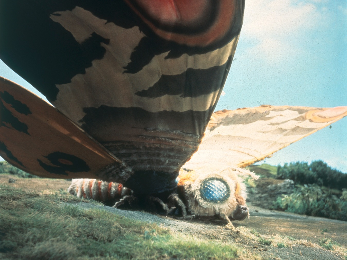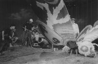 For the portrayal of the surviving Second Generation Mothra's imago stage in Ebirah, Horror of the Deep, both the large imago prop with a two meter wingspan from Mothra and the main prop from Mothra vs. Godzilla were used. Wires were sewn onto the Indian fabric of the wings to reinforce them. A matte painting was used to depict Mothra sleeping on Infant Island.[9] Pair Bambi were placed on a platform covered in white fur to portray the Shobijin riding on Mothra's head.[11]