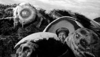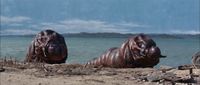 The heads of the Mothra larvae in Mothra vs. Godzilla were sculpted by Teizo Toshimitsu, while the bodies were modeled by the Yagi brothers Kanju and Yasuei and Keizo Murase. The larva props were made from urethane. Two larva props were created and equipped with self-propelling internal mechanisms and wheels, along with two manually-operated props. The same technique used for the self-propelled larva props would be used for the monster Namegon in Ultra Q two years later. For the scene of the two larvae hatching from their egg, two hand puppets of the larvae's heads 2.5 times larger than the heads of the main props were operated by a puppeteer inside the egg model. The beaks of the larvae were made of wood and painted with rubber. The hand puppets featured differently-colored eyes for each larva: one possessed red eyes, while the other had blue eyes. The full larva props used for the final battle sequence on Iwa Island both possessed blue eyes. The silk spit by the larvae was created by spraying a rubber paste dissolved in thinner. During filming, this silk compound was known to get stuck to the faces of staff members.[9] A self-propelled and a manually operated larva prop were reused for the surviving Mothra larva in the following film, Ghidorah, the Three-Headed Monster. For this film, the eyes of the props were changed from blue to red.[9]