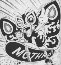 In "Vs. King Ghidorah Edition", Mothra had been having a streak of bad luck when Belvera and King Ghidorah arrived to challenge him. Daunted by his recent misfortunes, Mothra Leo fled, and after remarking that he may have had more luck earlier in the week, the Elias informed him that he could travel through time. Mothra proceeded to do so, bringing all three Elias, King Ghidorah, and a boy named Shota Sonoda with him, only to travel too far back and end up in prehistoric times. Despite feeling that luck was on his side, Mothra was nevertheless beaten to a pulp before King Ghidorah was chased away by a Tyrannosaurus rex. The group then met Primitive Mothra, who showed Mothra a technique to transform into Armor Mothra by cocooning himself for millions of years, though Primitive Mothra was able to speed up the process by shaking the cocoon. Armor Mothra emerged mere minutes later, but the armor proved too heavy, prompting Mothra to discard it. While changing, King Ghidorah walked in on Mothra, causing the flustered Mothra to knock King Ghidorah out with one punch. The group then returned to the present. Some time later, Mothra hit his head and developed severe amnesia, unable to recall his own name. King Ghidorah and Belvera somehow returned and challenged Mothra again, only to stop upon hearing of his memory loss, with King Ghidorah vowing to help Mothra remember so they could battle properly. The group tried various techniques to jog Mothra's memories, from showing him familiar mementos to tying him to a kite to relearn how to fly, and while Mothra was able to recall a few of his powers and the fact that he was a hero, he failed to remember anything else. Mothra eventually resigned to his fate and returned home. However, upon hitting his head again, he exclaimed that he was able to remember. King Ghidorah eagerly anticipated the continuation of their fight, only to be punched aside as Mothra revealed he merely remembered what television program he wanted to watch.