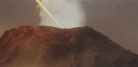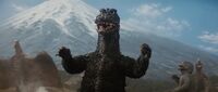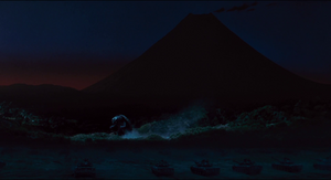 While Mothra created her cocoon on the National Diet Building, Mount Fuji unexpectedly began to erupt. Godzilla, having been trapped underneath the Earth's crust after falling into the Philippine Trench, had swam through molten magma until he was underneath Mount Fuji and emerged from it. Godzilla walked out of the mountain's crater and made his way to Yokohama, obliterating the JSDF's forces along the way.