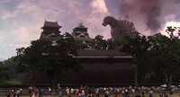 As Godzilla rampaged across the countryside, he encountered Nagoya Castle on the outskirts of the city. As Godzilla continued to advance, he suddenly tripped on the castle's moat, and fell onto the keep, breaking it into several pieces.