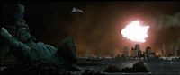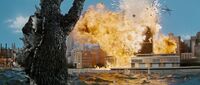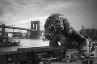 Godzilla attacked New York City, destroying the Queensboro Bridge before picking up a train and biting it, then rampaging in the main city, setting it ablaze with his atomic breath and taking out firefighters that were trying to spray him with water. Soon afterward, Jay Gatsby's G-Force attacked him with tanks, forcing Godzilla to leave, with Gatsby thinking that he had driven him off before Godzilla swam to London.