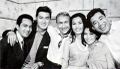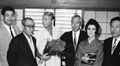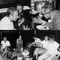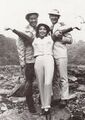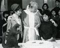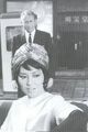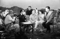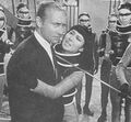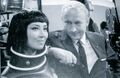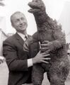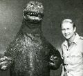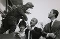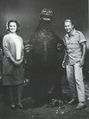 Haruo Nakajima partially exits the Baragon suit to converse with co-star Nick Adams on the set of Frankenstein vs. Baragon