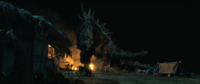 On the island, Yamane's team detected large levels of radiation on one side of the island. They also discovered a huge radioactive depression on the ground, in which Yamane discovered a perfectly preserved Trilobite. Suddenly, a lookout on the island began to ring a bell, announcing that Godzilla had been seen on the other side of the island. Everyone ran to a hill on the island, where they were all confronted with the 50-meter reptilian beast himself. Godzilla roared at the crowd, causing them to flee in terror. Godzilla then walked back to the ocean and swam away.