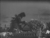 Following his first fight against Anguirus, Godzilla made landfall in Japan on the shore of Osaka. To protect the city, a blackout was carried out, while JASDF aircraft deployed flares to lead Godzilla back out to sea. Godzilla was distracted by the flares, and, as Dr. Yamane predicted, started to leave.