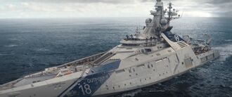 Outpost 18 resembles a primarily white ship or yacht. It sports a helipad on its deck.