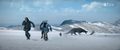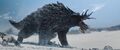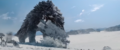 2015: As the group marches, Kentaro asks May to slow down; she retorts that he needs to speed up. Lee agrees with Kentaro, saying that she needs to conserve her energy to fight off the hypothermia. Kentaro proposes drying May's legs, but Lee tells him that they have nothing to build a fire with and can't stay put with the Frost Vark on the hunt. He explains that his decades of experience with Monarch will be of little help against it, as no two Titans seem to be the same. Cate questions where the group is going with night approaching, and Lee clarifies that they are heading northwest, the most likely route to encounter people. Kentaro then mentions that he had seen a large round building from the plane, but finds that no one else in the party noticed it. Kentaro confronts May, as he assumes she had seen it too and was just lying because she was angry, but she snaps back that she had never seen it and that this is about her hypothermia.