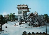 After the Kilaaks took control of the kaiju on Monsterland, they sent Gorosaurus to attack Paris. Gorosaurus burrowed up from underneath the Arc de Triomphe, causing it to collapse.