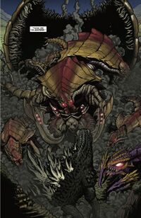 Godzilla soon made landfall in Peru, searching for Burtannus. He burrowed into her tunnels from the sea and confronted her and her offspring, forcing them into open waters. Burtannus and Godzilla fought until the subterranean monster knocked the monster king unconscious with a powerful blow to the head, giving her and her offspring an opportunity to flee into the sea.