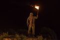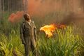 At night, Packard prepared his trap, instructing his men to pour napalm into a lake, before setting off another set of explosives farther away to flush Kong out. The Titan appeared from the forests of Skull Island and charged towards his men through the river, and Packard lit the lake's surface ablaze with a torch. After a brief clash, Kong collapsed from severe burns. Packard then had his men lay down the remaining seismic charges around Kong's fallen body to blow him up, when Conrad's group intervened, resulting in a standoff. Suddenly, the Skull Devil emerged from below the lake, causing the survivors to fall back, but Packard remained behind, still determined to kill Kong. Before he could set off the explosives, Kong regained consciousness and slammed his fist down on him, killing the Lieutenant Colonel.