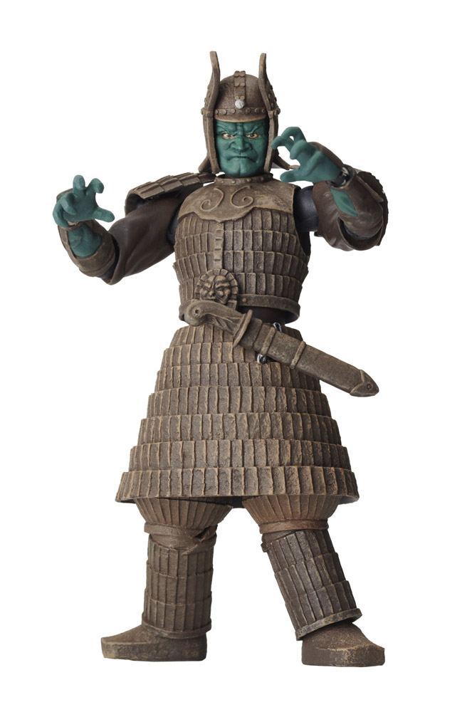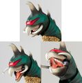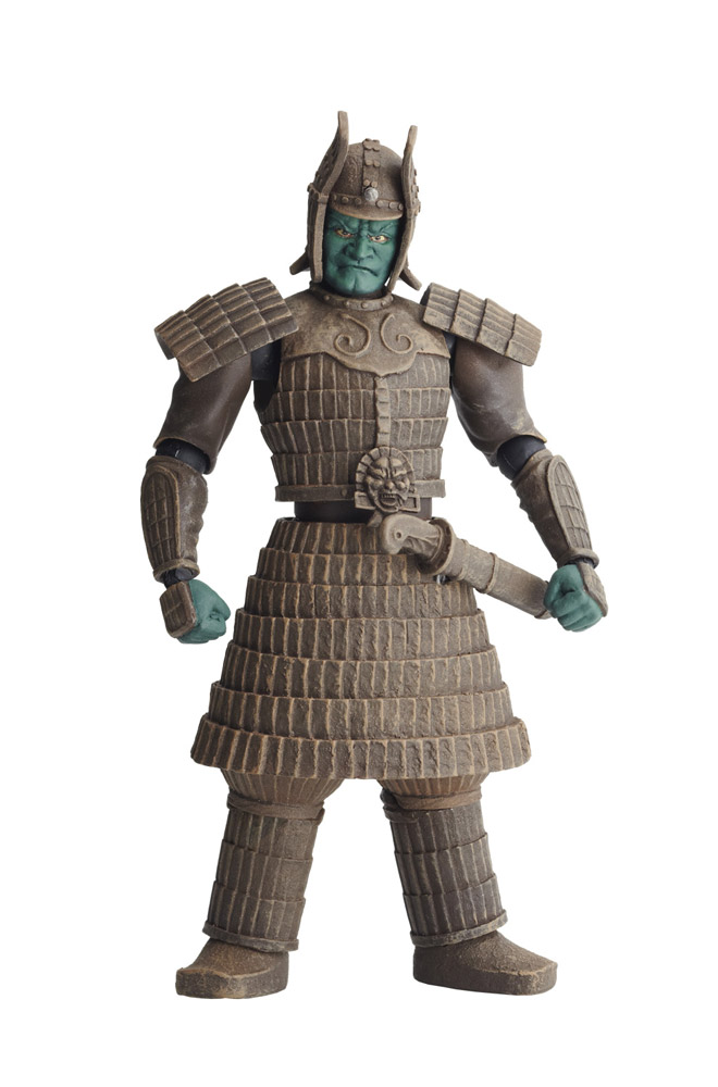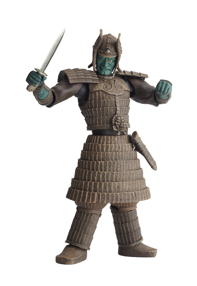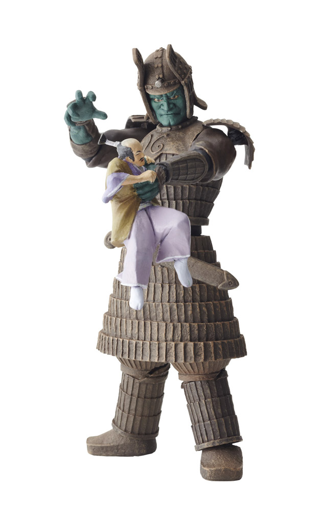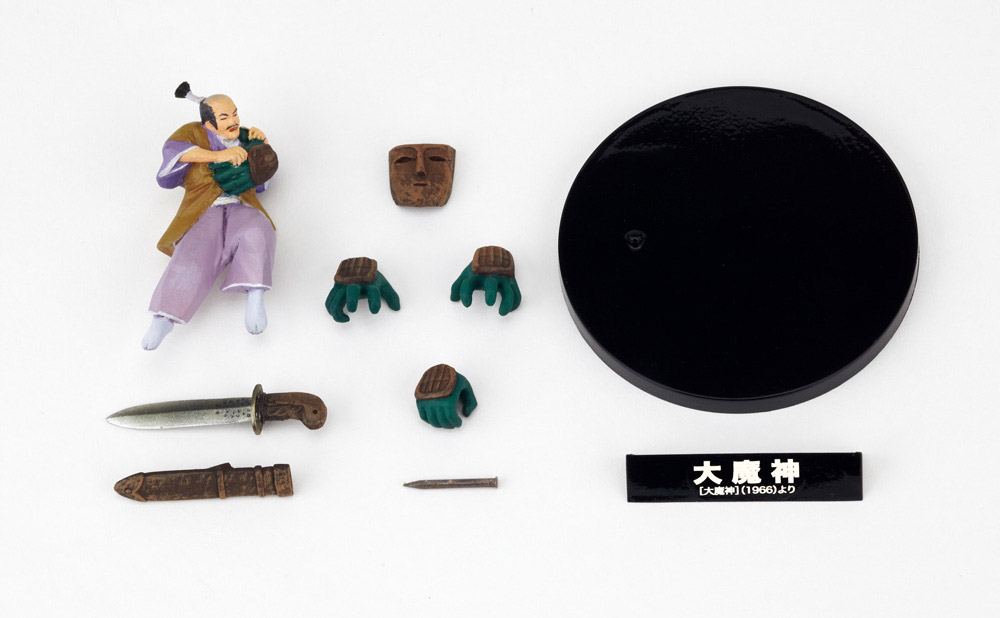 The Daimajin figure includes both a sheathed and drawn sword, four alternate hands, including one holding a samurai, an alternate face plate, a stake, and a display stand. It was first released in 2011 and later rereleased in 2017.