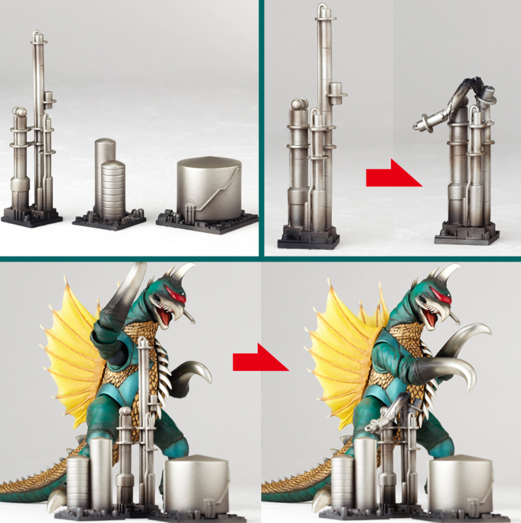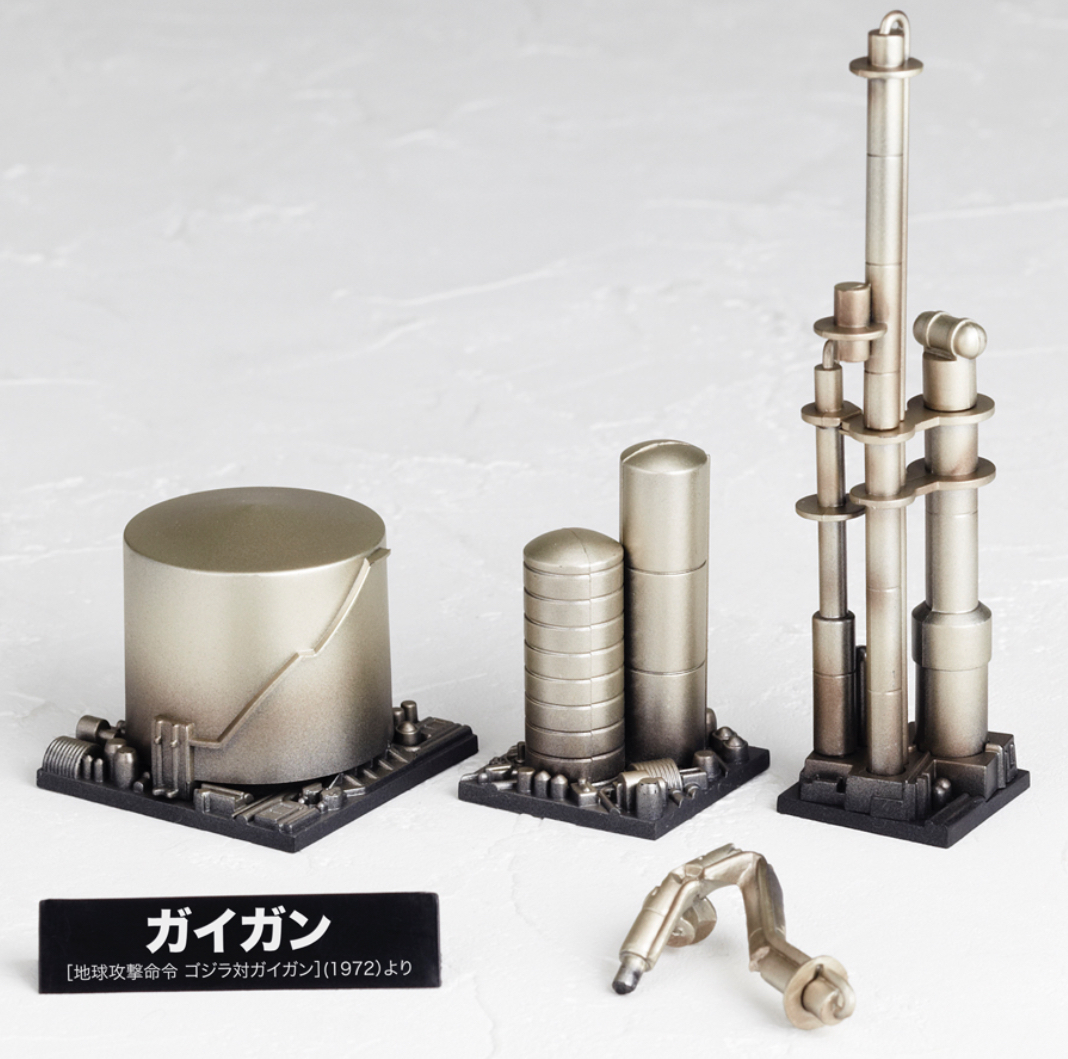The Gigan figure is based on the monster's appearance in Godzilla vs. Gigan (1972), and comes with several buildings.