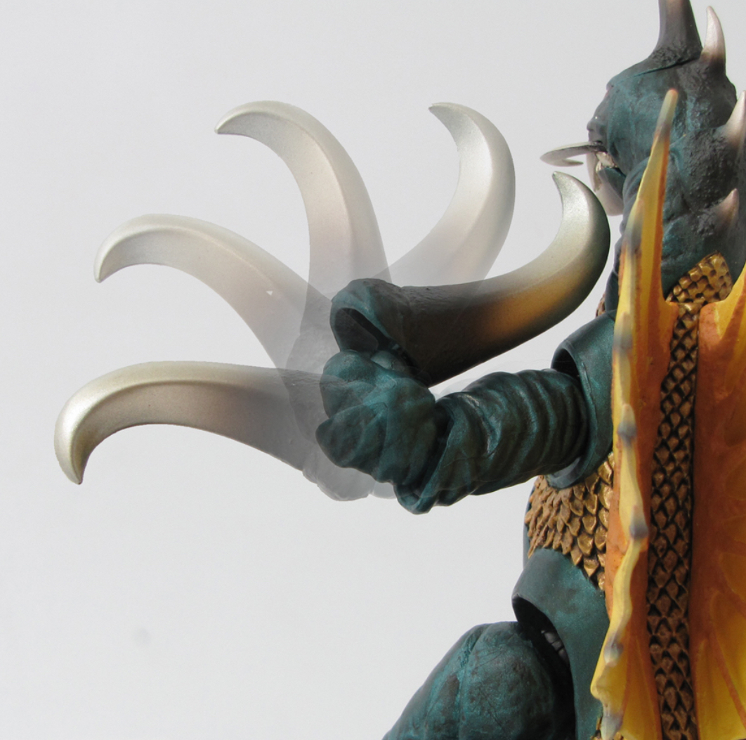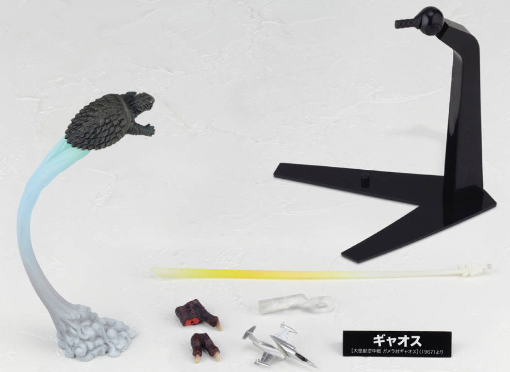 The Gyaos 1967 figure comes with a small Gamera figure, a flying stand, a severed foot, a broken fighter jet, a miniature flying Gamera, and an ultrasonic scalpel effect. It was released in 2011.