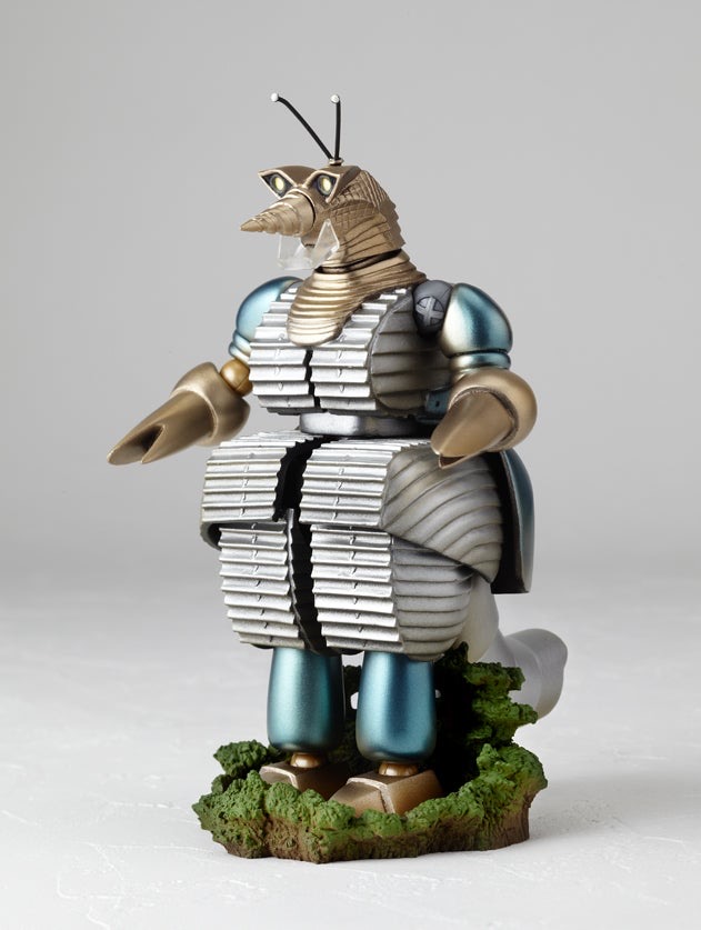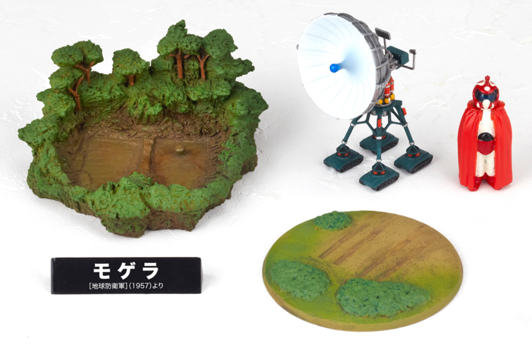 The Moguera figure is based on the robot's appearance in The Mysterians (1957), and comes with a Mysterian, a Markalite Cannon, and some forest bases.