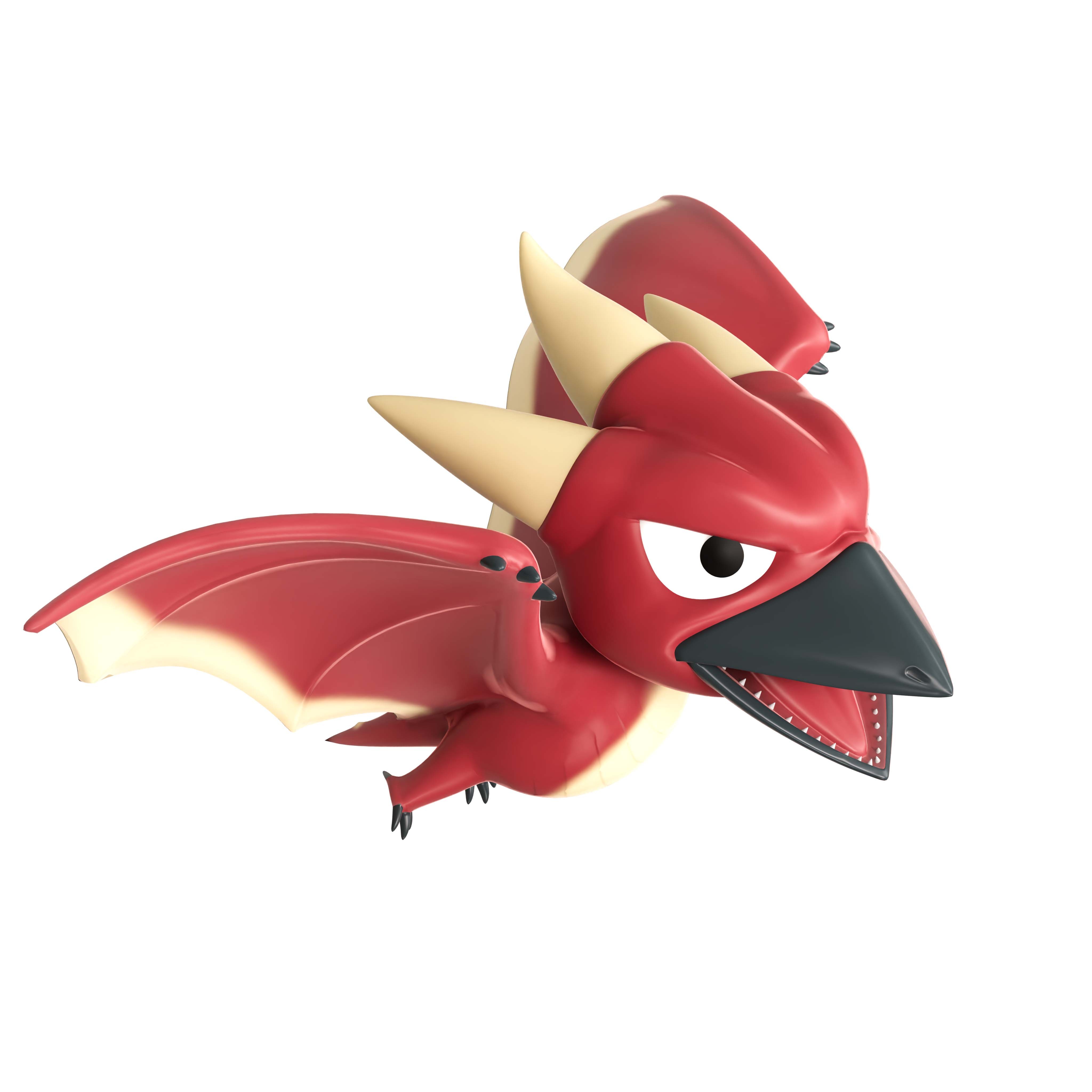 Rodan resembles a large pterosaur that walks upright on two legs. Rodan generally has either brown or burgundy skin with a spiky chest and two to three horns on the back of his head.