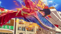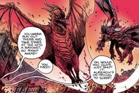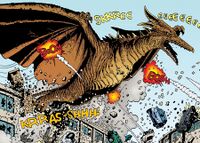 The Demon Rodan confronted Godzilla as he arrived in a city in Hell, charging at him and dodging his atomic ray. The Demon Rodan then soared into the clouds in preparation for another attack, only for Godzilla to catch him by surprise first by slamming his tail into his demonic foe, causing the Demon Rodan to crash into the doomed cities of Hell.