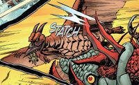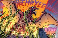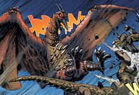Sometime later, the people of Earth-2 gathered many of their kaiju and sent them through the portal to Earth-1, which included a giant Rodan alongside Anguirus, Biollante, Zilla, King Caesar, Hedorah, and Mothra, while Mecha-King Ghidorah was fighting Godzilla. Rodan first turned his attention towards Godzilla and attacked him from behind while Mothra attacked him from the front. Later, after Mecha-King Ghidorah was defeated by Godzilla, all of the monsters were left behind as the humans left the Earth as it became covered by tiny robotic cells that served as interdimensional doorways.
