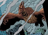 Rodan, known to some ancient civilizations as the "Fire Demon," was a colossal winged Titan with an affinity for magma and volcanoes. He was dreaded by ancient humans for his ability to level entire cities by simply flying over them. Rodan eventually took up residence in the volcano on what was later Isla de Mara in Mexico, entering a state of suspended animation within the magma-filled crater. Monarch, a scientific organization founded in the aftermath of World War II in order to study and search for Titans, had become aware of Rodan's existence by 1973 through analysis of ancient cave paintings depicting him and other Titans such as Godzilla, Mothra, and King Ghidorah. Monarch eventually found Rodan in pyrostasis within the Isla de Mara volcano in 1991, forming Outpost 56 around the volcano in order to contain and study him.[13] Rodan remained dormant until 2019, when eco-terrorist Alan Jonah and rogue Monarch scientist Dr. Emma Russell used the sonar device Orca to begin awakening dormant Titans in an attempt to restore the natural order. They remotely disabled the containment system at Outpost 56 and broadcast the Orca's signal in order to awaken Rodan, who burst from the crater. Monarch's G-Team engaged Rodan with fighter jets and the flying fortress USS Argo in order to lure him away from the nearby village and into the path of the approaching King Ghidorah, who had previously been awakened by Jonah and Emma. Rodan gave chase after the G-Team squadron, bringing down all of the fighters and nearly grabbing the Argo with his talons before encountering Ghidorah. Both Titans clashed in the air, with Ghidorah triumphing and blasting Rodan into the sea with a gravity beam. After the United States military used the Oxygen Destroyer in an attempt to kill both Ghidorah and Godzilla, the three-headed Titan emerged from the blast unharmed and landed atop the Isla de Mara volcano, regenerating the head that Godzilla had just torn off and emitting a cry that awakened all of the other dormant Titans and bent them to his will. Rodan too submitted to the new alpha Titan, landing at the foot of the volcano and bowing before Ghidorah.