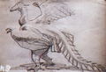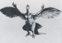 While the finalized design for Rodan draws characteristics predominantly from the Pteranodon, early concept art for the monster more closely resembles Archaeopteryx,[8] with large feathers protruding from its wings and a long, feathered tail, and assuming a more hunched, bird-like posture. This concept would ultimately be scrapped by director Ishiro Honda and a design closer to the final product was instead pursued, with a number of models created using said design, based on casts of clay prototypes[2] sculpted by Teizo Toshimitsu.[11] The first created model interestingly carries over the idea of Rodan possessing a long tail, however it is greatly altered and less so resembles that of a bird. A second model based around a seemingly identically molded chest to the first was also made, and is featured in some promotional materials.[2]
