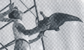 According to Yoshio Suzuki, the body of the suit for the first generation Rodan(s) was tailored to the measurements of suit actor Haruo Nakajima's body.[12] The suit was immensely heavy at a weight of approximately 150 pounds[13] (~68 kilograms), and thus its wings, constructed of Indian cloth and coated with liquid latex, would have been exceedingly difficult to support for long periods of time with nothing but the strength of the arms of its actor. To counteract this, lengths of bamboo rods were split up and bent using the heat from a charcoal fire, and inserted throughout between its shoulders and wings for support.[12] The wings were further supported and operated with piano wires,[12] however their movements were dictated entirely by Nakajima.[14] This proved to not be the only inconvenience for Nakajima spawned from the build of the suit, however, as its knee joints were constructed to accurately reflect those of real birds, moving opposite to the joints of mammals.[14] An upper-half hand puppet of Rodan with a movable head and wings[11] was also made for close-up shots,[2] such as when the monster unleashes its radioactive wind breath attack, and was said to have been occasionally operated by more than one person at a time depending on the scene.[11]