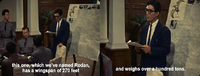 1. 1.0 1.1 Although a large portion of Japanese sources list the First Generation Rodan's stats as the same as that of the Second Generation's, Rodan is said to have an estimated 270 foot wingspan and over 100 ton weight during dialogue in its debut film, and some sources, such as Encyclopedia of Godzilla (Mechagodzilla Edition) (p. 61), make note of this distinction. Godzilla vs. Biollante Great Encyclopedia doesn't make any clear distinction between the Rodans on page 56—listing the Second Generation's height and weight, though it still says Rodan's wingspan is 81 meters on page 74. Additionally, in the American version of the film, Rodan's wingspan is instead estimated at "perhaps 500 feet."