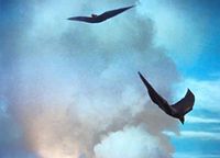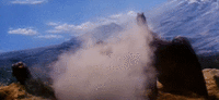 Both Rodans attempt to flee from the erupting Mount Aso