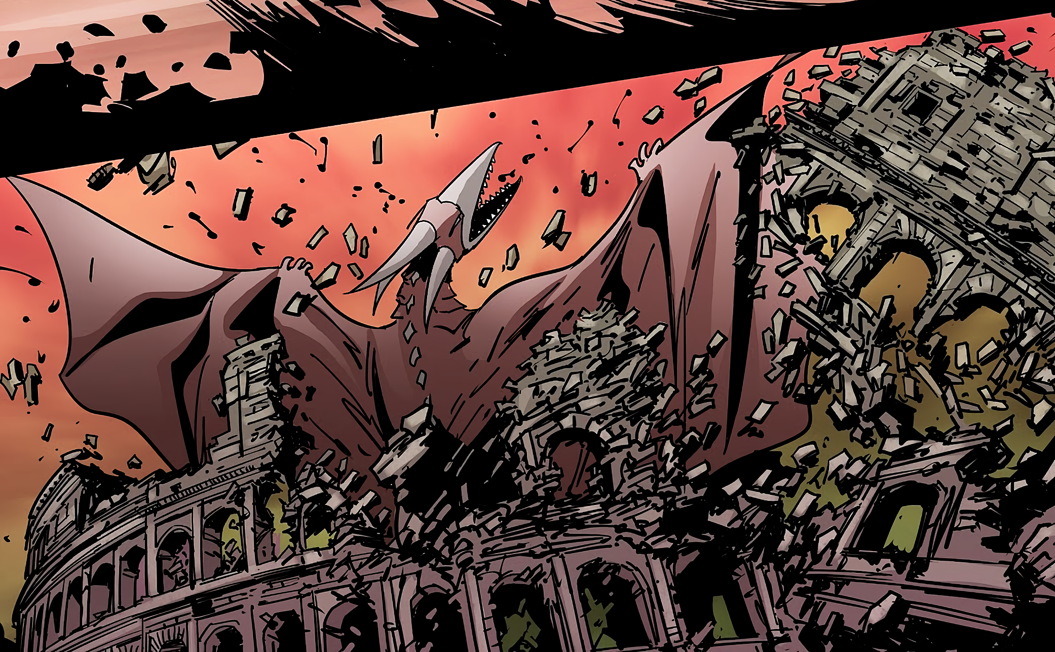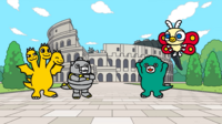 Godzilla, Rodan, Hedorah, and Mothra battle King Ghidorah in the middle of Rome during ancient times. Initially, the Earth kaiju attack individually, and, after dispatching Hedorah, Ghidorah throws Rodan away with his wings. Rodan falls onto the Colosseum, partially destroying it.