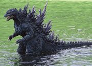 One aspect of Godzilla design that received many variations in the design process was his dorsal plates.[1] The dinosaur-esque design created by Broadmore featured triangular-shaped plates like previous designs and his atomic breath was more electrical-based, similar to Frank Hong's early keyframe art.[2][3][4] Gareth Edwards did not like this design, saying that the plates were "incredibly big" and added that "you didn't see that form anywhere else on his body." Edwards also felt that the lightning effect made it difficult to understand what the audience was looking at.[3] Another potential design by Christian Pearce had the dorsal plates resemble the plates of Stegosaurus.[5] At one point Godzilla had porcupine spines in place of his signature plates. Though Edwards admitted that he liked this design, saying that it made Godzilla aggressive, he rejected it explaining "The problem is it just isn't Godzilla."[6] Two designs also featured a fish-like dorsal fin in place of Godzilla's signature plates.[7][8] One design that Edwards thought would be the final option for the fins was a fish-like design.[9][10] Christian Pearce and Andrew Baker, concept artists responsible for designing Godzilla who were also fans of the kaiju, were known to have arguments with Edwards to keep Godzilla's atomic breath and the shape of his dorsal plates. Eventually, Edwards agreed to keep the atomic breath,[11] but he disagreed with the design of the plates and chose an angular, broken slate look with his reasoning being that this trait "made more sense, as if the fins growing out of [Godzilla] are brittle and break."[12] However, the maple leaf-shaped dorsal plates seen in the majority of Godzilla's designs would later be incorporated into the GareGoji design by the time the 2012 Comic-Con teaser trailer was made.