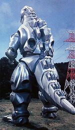 The Showa Mechagodzilla's dorsal fins are more basic in appearance compared to Godzilla's as they are smaller and less spiky, and appear in three rows down its back, starting near the top of the head and moving down to the Unisot (ユニソット Yunisotto) on the end of its tail.[14] The rebuilt Mechagodzilla featured in Terror of Mechagodzilla, dubbed Mechagodzilla 2, has some differences in its dorsal fins: it only has one row of dorsal plates on the back of its neck rather than three and a lack of dorsal fins at its midsection.