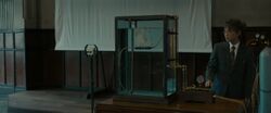 Following Godzilla's destructive raid on Tokyo's Ginza district, the Japanese government secured the return of four IJN destroyers as part of a desperate civilian-led plan to destroy the monster. Former naval engineer Kenji Noda revealed a wood model of Godzilla, weighted just enough to float in a tank of seawater. He asked the citizens what would happen if the model was enveloped in Freon gas bubbles. After one citizen said it would stay afloat, Noda released the gas valve into the tank. The model was surrounded in bubbles and sank to the bottom, surprising the attendees. Noda explained that the bubbles prevented the model from contacting the seawater, with the idea of sinking Godzilla using that method. The scientists closed the blinds of the meeting room and projected slides behind the naval engineer. Noda explained that they would use two ships to circle Godzilla with a wire of Freon canisters before rupturing them, sinking the monster 1,500 meters into Sagami Bay to induce barotrauma.