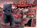 In 1954, Godzilla suddenly appeared in Tokyo, emerging from Tokyo Bay into Shinagawa concealed in a cloud of smoke with the exception of his dorsal plates, which illuminated the surrounding area in an intense glow of white. Nearby, lieutenant Ota Murakami and his best friend, Kentaro Yoshihara, were stationed with their Sherman Tank platoon to aide in disaster relief under the advised expectation of "bad weather." Suddenly, a bright, fiery beam of energy cleaved through a building in close proximity. Before the members of the platoon could comprehend the situation, a thunderous roar followed by a massive step unveiled the source of the destruction: Godzilla. The King of the Monsters' sheer mass sent many buildings crumbling to the ground before Murakami gave the order to open fire. The tank shell barrage having only succeeded in acquiring his attention, Godzilla turned to his attackers as his dorsal plates glowed. He subsequently fired a blast of atomic breath that obliterated the entire platoon with the exception of the tank housing Murakami and Yoshihara, who barely drove off the street in time. Godzilla continued east downtown towards north Shinagawa, where civilian evacuation was stalled. With "group 2" for whatever reason unable to tend to the situation, Murakami and Yoshihara put it upon themselves to keep Godzilla occupied long enough for the civilians to evacuate. Before long, Godzilla gained in on a fleeing crowd, only to be halted by the fire of the remaining Sherman tank. Coldly enraged, Godzilla bellowed and stomped into pursuit of the vessel, managing to almost hit it with an atomic blast. While the two soldiers believed they had lost Godzilla in the surrounding smoke, the Monster King cleaved a building in half with his tail to topple on them, from which, they again barely escaped. When they once again thought to have eluded him, Godzilla suddenly appeared behind them and nearly steps on them. Persisting the pursuit, Godzilla charged up his atomic breath once more before an artillery barrage stopped him from firing. With no other option, Murakami ordered Yoshihara to drive off the street into the canal, saving themselves as Godzilla came to a stop. Surrounded by smoke, Godzilla stared off into the sky before returning to the bay off-panel.