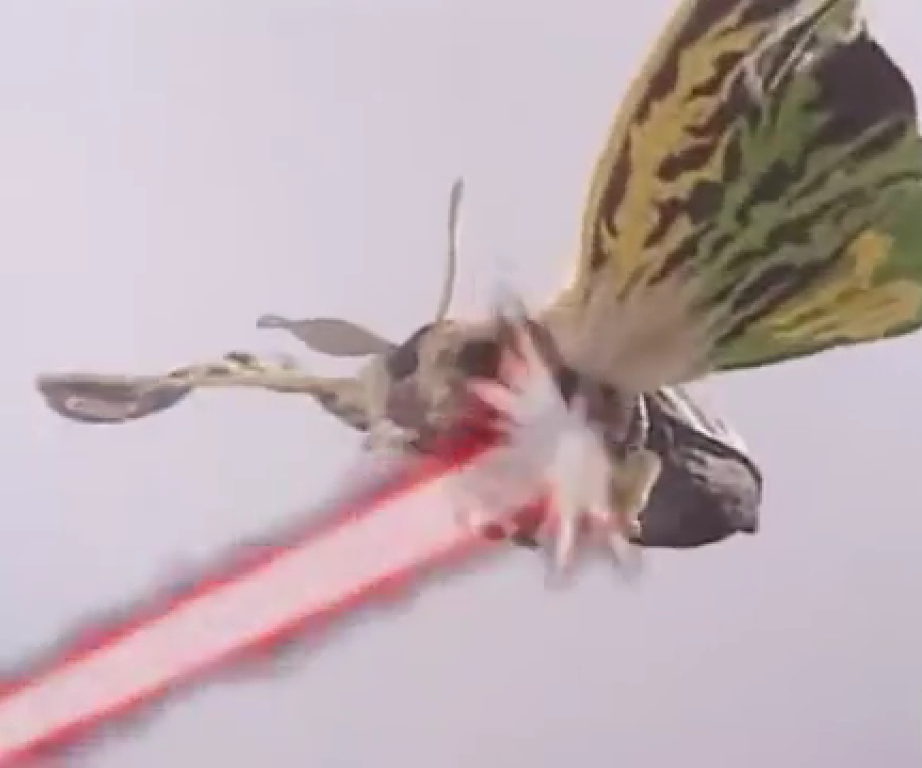 The SpaceGodzilla-possessed Godzilla's red atomic breath striking Mothra Leo