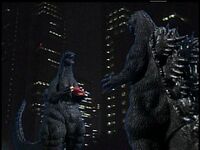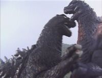 Godzilla was first seen resting in his cave on Godzilla Island, leaving when he detected the UFO Vabaruda travelling towards the island. Godzilla was later seen watching a smaller, red spaceship fly towards the Vabaruda and then the arrival of SpaceGodzilla. When SpaceGodzilla arrived on the island and began to attacking the G-Guard base, Godzilla wished to battle the space monster but waited until G-Guard Commander Beisuke Jinguji ordered him to do so. Godzilla began to wrestle with his extra-terrestrial doppelganger who was comparable in strength to him and then targeted SpaceGodzilla's shoulder with his atomic breath when Torema advised him to do so, destroying his left shoulder crystal. After Torema destroyed the right shoulder crystal with her ship's lasers, Godzilla fired his atomic breath simultaneously with the red spaceship's lasers, destroying SpaceGodzilla.