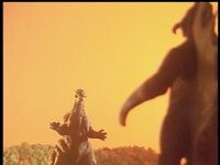 When Lucas later reported Destoroyah and Megalon coming back to the island in order to attack the anti-aircraft laser cannon intended to destroy the artificial sun, Beisuke Jinguji ordered Godzilla and Rodan into action to stop the two monsters. While Rodan battled Megalon in the sky, Godzilla and Destoroyah began fighting on the ground. Godzilla easily threw Destoroyah to the ground but was then badly hurt by Destoroyah's Oxygen Destroyer Ray, the energy suppressant having been flushed out of his system by the Xiliens. After Destoroyah caused Torema to miss her target and then attempted to fully destroy the cannon, Godzilla got back up but was again knocked to the ground by Destoroyah's Oxygen Destroyer Ray. After Rodan knocked Megalon to the ground and caused him to land on Destoroyah, Godzilla recovered just after Destoroyah and stopped him from attacking the laser cannon. Godzilla accidently hit a solar panel with atomic breath while aiming at Destoroyah but this had the effect of charging it up faster though Destoroyah interrupted him when he tried to fire his atomic breath again at Torema's request. Luckily, Rodan arrived in time and threw Megalon into Destoroyah, allowing Godzilla to charge up the solar panel and help Torema fire the cannon and destroy the artificial sun. After Megalon and Destoroyah were ordered to retreat, Godzilla later celebrated the arrival of rain with the other monsters on the island.