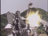 Godzilla charged in but was badly injured by the Infrared Auto-Blaster placed near Junior's cell though refused orders by Torema and Beisuke Jinguji to retreat, forcing Rodan to pick up Godzilla and carry him to safety. Mother Mothra later landed in front of Godzilla and Rodan and they came up with a plan to rescue Junior. Godzilla followed Mothra after she disrupted the Auto-Blaster's sensors with her pollen and caused it to fire wildly, hitting the weapon with atomic breath after it fired at both the Vabaruda and Battra. After Moguera, piloted by Torema, knocked Megalon out and opened Junior's cage, Godzilla and his son reunited though their reunion was short-lived as Zagreth summoned Destoroyah who promptly punched Junior to the ground. An angered Godzilla tried to intervene but Destoroyah easily knocked him down with an Oxygen Destroyer Ray. After Destoroyah avoided Moguera's eye beams and easily defeated Rodan, Godzilla got back up and fired atomic breath though Destoroyah easily dodged this and began to wrestle with Godzilla. Godzilla finally defeated Destoroyah by kicking him in front of the damaged Auto-Blaster which fired at him and caused a large explosion.