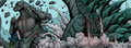 Godzilla arrived on Monster Island and attacked Biollante as the latter besieged the Cryog mothership, his atomic breath causing the Devonian kaiju to drop the vessel, killing nearly all on board. Godzilla emerged from the wreckage and crushed several Cryogs, seemingly killing their commander Rhizon. Godzilla was suddenly attacked by Biollante's tendrils before her full body reemerged. Biollante lifted Godzilla up and slammed him down before tossing him away. Her tendrils bite down on the back of Godzilla's neck but are destroyed by a nuclear pulse. Godzilla roared at Biollante only for the larger monster to slam him into the side of the island's volcano. She pulled Godzilla back towards her and doused him in acid. Godzilla retaliated with a blast of his atomic breath before firing at the island's volcano, causing it to erupt. With the plant kaiju ignited by the lava, Godzilla further incinerated Biollante's core before returning to the ocean.