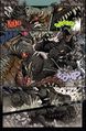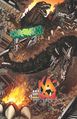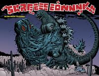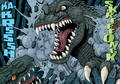 200 miles west of the coast of California, Godzilla investigated the remains of the USS Goldstein, which had been destroyed by Manda and bore no survivors, courtesy of Gezora. Godzilla looked down at the water before he was suddenly dragged down below the surface by something. Godzilla would soon free himself from his mysterious attacker off-panel, making his next appearance in Malibu, California, where Godzilla collapsed down onto the ground. Godzilla had succumbed to a deep wound inflicted on his chest from his earlier underwater struggle, his nostrils emitting smoke and bleeding as he lay in pain due to the severity of the chest wound.