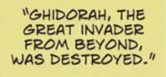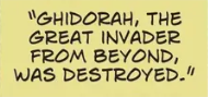 King Ghidorah was originally an extraterrestrial monster controlled by the Xiliens as part of their invasion force to conquer Earth. However, the invader was eventually killed in ancient Rome by the combined forces of Godzilla, Mothra, Rodan, and Hedorah, the latter being a defective Xilien probe. King Ghidorah would go on to inspire tales of the Hydra, presumably told by those who witnessed the battle in Rome.