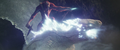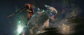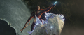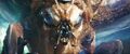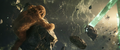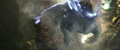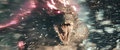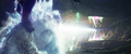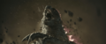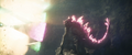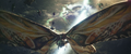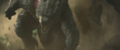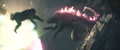 While Kong attracted Godzilla to his position with a battle cry, Jia ascended the steps to the top of the Iwi pyramid and extends a hand, causing Mothra to be resurrected and materialize before her in her imago form. She departs for the same portal as Kong. The Iwi queen orders the village evacuated, and Beasley asks Andrews permission to gather reinforcements. Afterwards, the Iwi release a liquid metal to force together the two largest electromagnetic pyramids, which will unleash a brief antigravity shock wave when they collide. The Skar King uses Kong's axe to breach the barrier, and commands Shimo to freeze the gap between the pyramids, preventing them from touching. Beasley returns with a flock of Vertacines, having used the HEAV's camouflage to lure them. They briefly hold back the Skar King's army, buying Beasley enough time to land and pick up a gleeful Hayes, Andrews, the Iwi queen, and one of her guards before Shimo shoots the creatures down. Godzilla and Kong launch from the vortex and charge towards the army as the ice between the pyramids shatters and they resume moving. Kong hops on Godzilla's back, then launches himself at the Skar King while Godzilla pounces toward Shimo. The Skar King leaps off Shimo's back to meet Kong mid-air, while Shimo lunges at Godzilla. Before they can reach each other, the pyramids collide, and the ensuing shock wave sends all the monsters floating through the air. Godzilla fights off a few apes before reaching Shimo. Kong blocks a strike from the Skar King's axe with the B.E.A.S.T. Glove. Mothra saves the malfunctioning HEAV from an ape with a blast of silk, then disables two more. One-Eye attacks Kong from behind, but Suko repels him with a pair of boulders. Shimo freezes Godzilla, but Mothra interrupts her by throwing a rock at her face, allowing Godzilla to shatter the ice and resume his attack. The antigravity wave starts to wear off, sending all the monsters falling. The Skar King launches himself towards a vortex, followed by Godzilla, Shimo, and Kong, who loses his axe in the process. Mothra catches the HEAV and sets it down safely. Suko kicks One-Eye off a crystal cliff to his death.