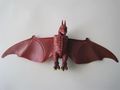 The Rodan toy was a crimson-red color, with black horns and a black beak lined with small teeth, yellow eyes, a column of plates in its chest, a 38-inch wingspan (for the "flying" gimmick), small legs and big feet with yellow claws.