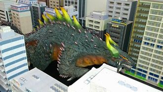 His body has several white spikes, black scales, large orange back spines and horns,and a orange and yellow underbelly. his head resembles that of a dragon with elongated nostrils that resemble cracks.