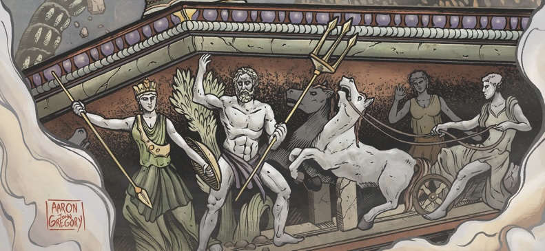 Zoomed-in image of carvings of Athena, Poseidon, Artemis, and Apollo in the retailer incentive cover by Aaron John Gregory