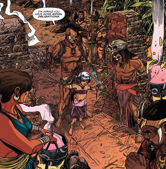 Until that point, the earliest glimpse into their origin came in James Asmus' 2016-2017 comic series Kong of Skull Island, which like most licensed works, was not strictly bound by DeVito's ideas about the world. The Tagu and Atu peoples were similar in many ways, but differed in their religious beliefs, with the Tagu being polytheistic, and the Atu being monotheistic. The Tagu had a royal bloodline, and had an honored individual called the Storyteller, who was tasked with recording the entirety of their history, and played a vital role in educating younger generations. The Atu however, were more religiously oriented, and were led by a shaman. Despite this, both camps bred and raised gargantuan apes called "Kong," or "Kongs." The Tagu were known for raising them with compassion and positive reinforcement, while the Atu operated on a fear-based platform. However, when the volcano on their home island threatened to destroy both civilizations, they fled to Skull Island, where the two tribes were united by the marriage of the Tagu prince K'reti to Usana, the daughter of the Atu shaman V'drell. This formed the Tagu-Atu people, which over time became shortened to "Tagatu."