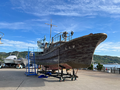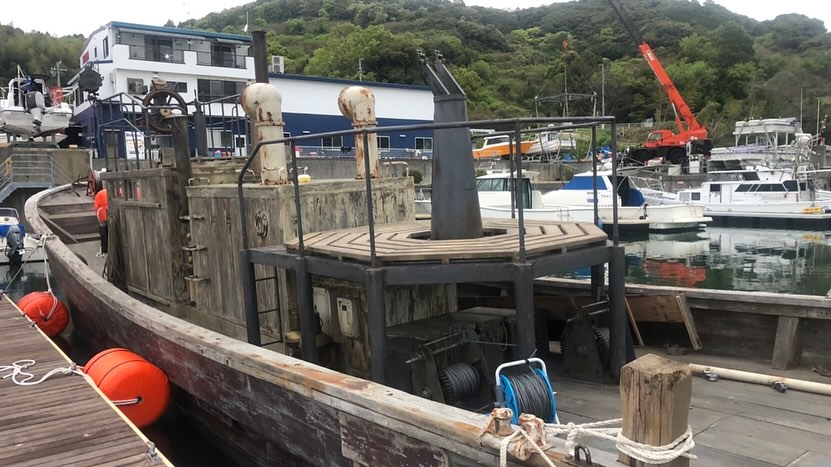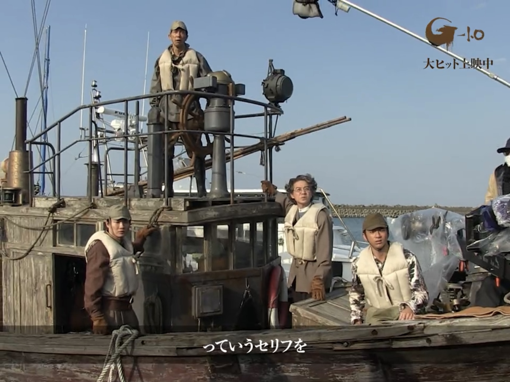 Director Takashi Yamazaki's inspiration for the Shinseimaru was the ship in Hayao Miyazaki's "The Poorest Front", an illustrated story about a Japanese fishing boat conscripted by the IJN during World War II.[2] Producer Go Abe and line producer Hirofumi Sakurai of ROBOT did location scouting all across Japan for a boat to use as the base for the Shinseimaru and for locations to film at sea.[3] It was difficult to find one that gave "a Showa-era feel" according to Abe. The farthest Sakurai traveled was to the Goto Islands in Nagasaki, and he finally found a boat in Nagoya through a dealer of second-hand boats.[4] It was a former fishing boat called the Hiroeimaru, with the base made of FRP and edges made of wood. It was taken to a shipyard on the Shima Peninsula, where the top half was removed and the hull and engine were kept intact so it could still function. The ship was then brought to TOHO Studios to add the wooden decorations.[3][2] The entire area around the studio was blocked off from midnight, and it took several hours to bring it inside.[3]It was barely big enough to fit on the premises and almost crashed into a nearby building. Since most of the ship was made of FRP, it was repainted to resemble wood. Many parts such as the machine gun were made of iron. Filming at sea was dangerous, so bars were installed for the cast and crew to grab onto in case of an emergency.[2] After being painted to an extent, it was disassembled because it was too tall for transport and taken to Lake Hamana, where it was reassembled by the shipyard there, fully painted, floated, and tested.[3] Kobe Kiyomitsu Co. managed the data measurement of the ship by laser scanning it.[5]