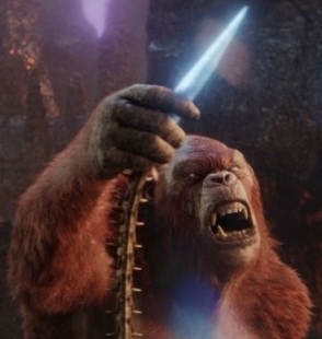 Much like Kong, the Skar King is intelligent enough to wield weapons, notably his Whipslash, which he uses very effectively in combat. He was able to direct an army of Great Apes to nearly kill Godzilla in ancient times, and still commanded their near-total obedience in the present day. His empire uses a form of sign language, which One-Eye used to explain to him that there was a portal near the Iwi city leading to the surface. In Rio de Janeiro, he tried using Suko as a hostage, knowing Kong was attached to the smaller ape.